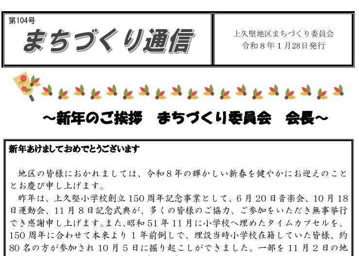 お知らせ・地域活動 「第104号まちづくり通信 令和8年1月28日」 kamihisakata 2026年1月27日 2026.02.26 「第104号まちづくり通信 令和8年1月28日」 まちづくり通信104号